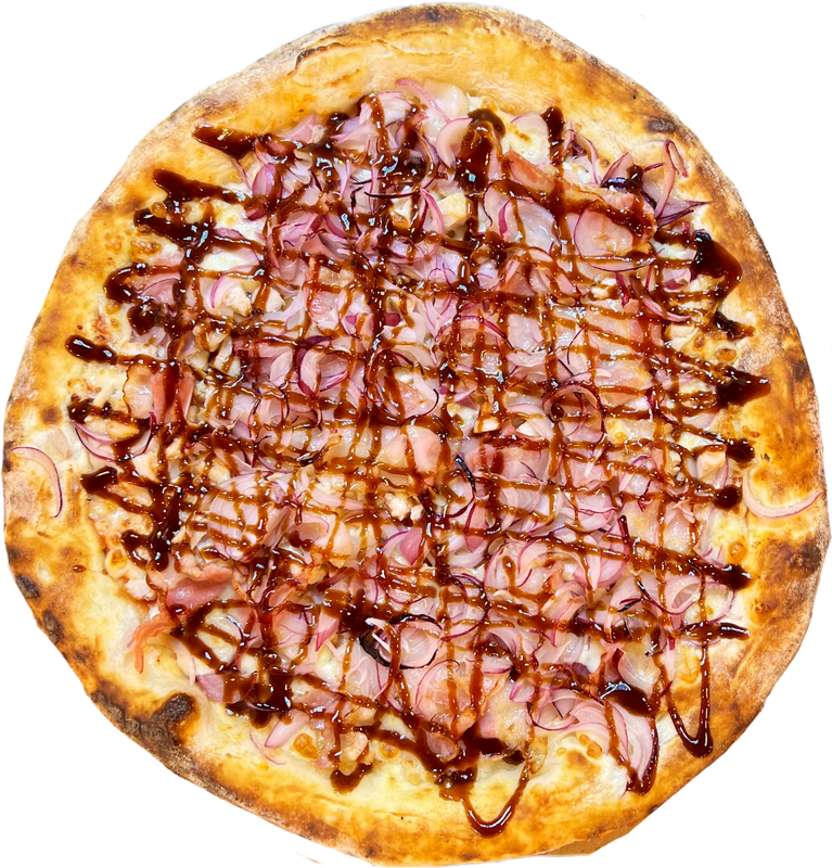 моцарелла, куриное филе, бекон, лук ялтинский, соус барберю, томатная основа
